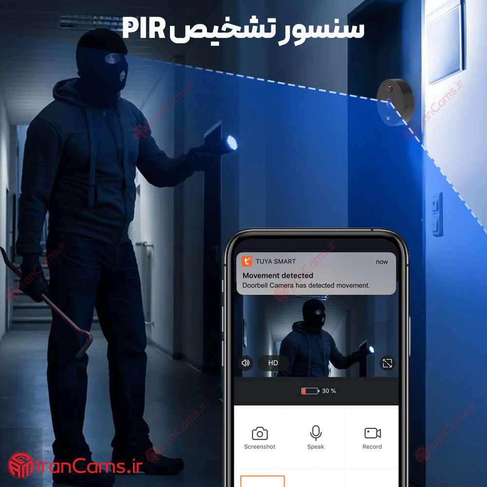 با وجود سنسور حرکتی PIR در دوربین چشمی درب دیجیتال مانیتور دار TUYA S32، دستگاه هنگام تشخیص حرکت به صورت خودکار شروع به ضبط میکند. این قابلیت مصرف باتری را کاهش داده و باعث ذخیرهسازی هدفمند تصاویر میشود. همچنین پس از تشخیص حرکت توسط لنز دستگاه، اعلان (نوتیفیکیشن) بر روی تلفن همراه خود دریافت خواهید کرد تا از شرایط محیطی خود با خبر باشید.